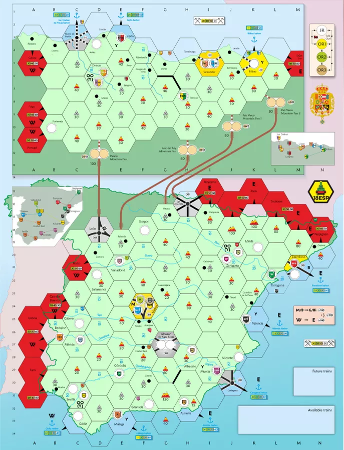 In addition, as special features 18España has a lot of mines, two maps that differentiate the zones in which narrow and broad gauge track were built, mountain passes that connect these two maps, major and minor companies, takeovers, different type of trains, etc.