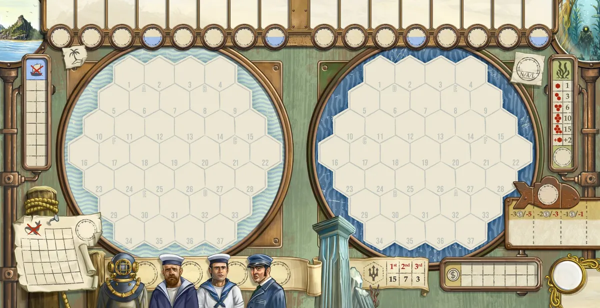 20,000 Leagues Under the Sea is a thematic exploration game inspired by Jules Verne’s classic novel. Players take on the roles of crew members aboard Captain Nemo’s submarine, the Nautilus, navigating between surface and depth maps in search of discovery, danger, and wonder. As they explore sunken ships, hunt marine creatures, and uncover the mysteries of Atlantis, they compete to earn points through smart decisions and spatial strategy.
