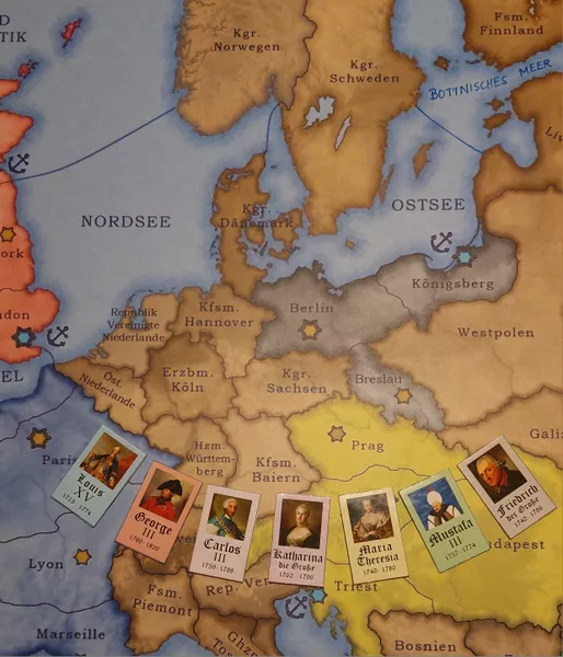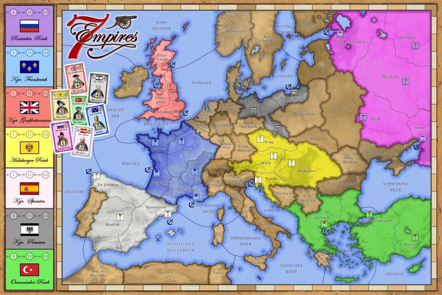In Europe in the age of Ancien Regime in 7 Empires, 2-7 players compete for political and military dominance. They gain and lose shifting control over seven old empires, some of them more powerful than others: Great Britain, Kingdom of France, Kingdom of Prussia, Russian Empire, Habsburg Empire, Ottoman Empire, and Kingdom of Spain.