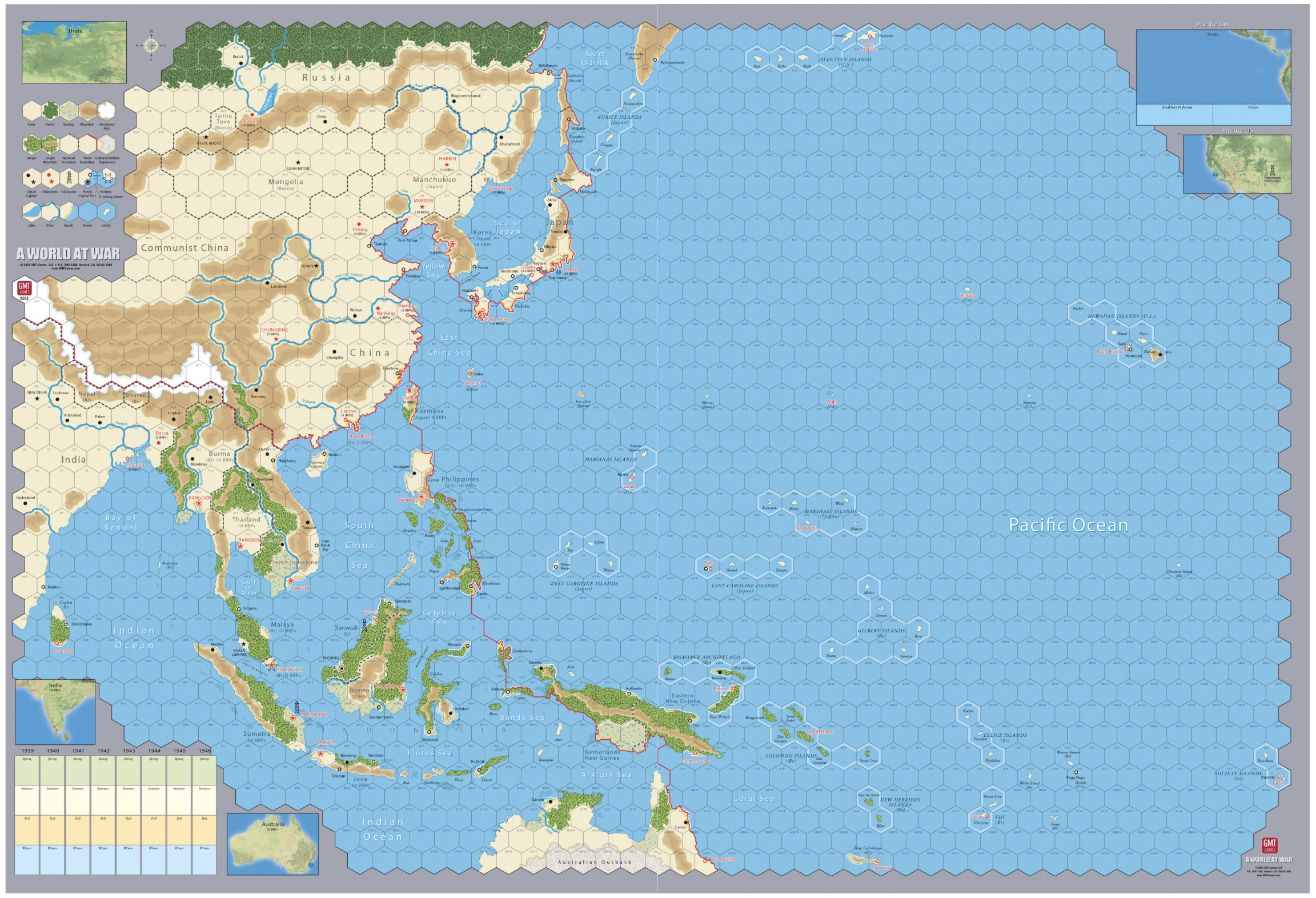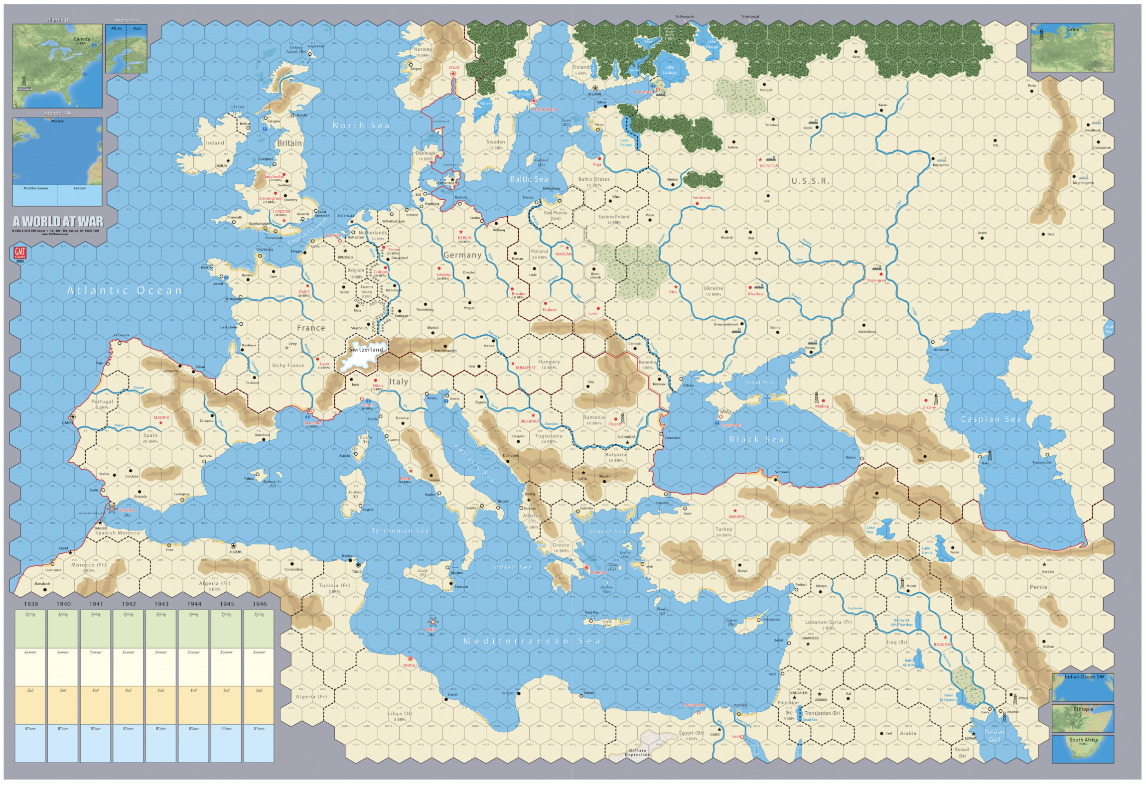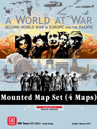Sztywne i twarde mapy do gry A World at War (4 mapy: 2 Europy i 2 Pacyfiku). Zastępują papierowe mapy z gry.