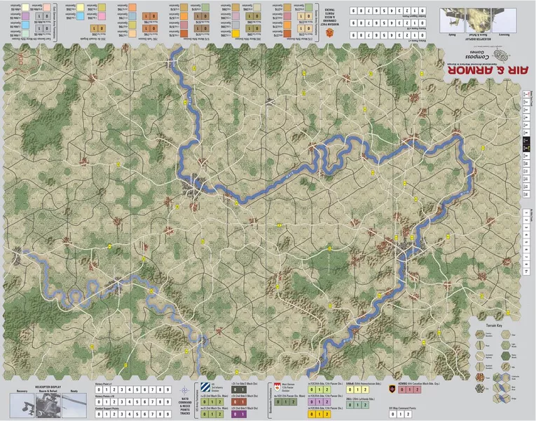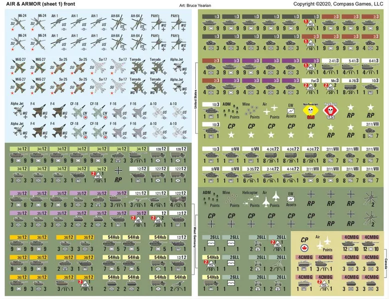 Air & Armor employs a highly interactive game system with asymmetric rules modeling the different command & control capabilities of each alliance. The game simulates all major aspects of modern warfare, including reconnaissance, combined arms operations, air, helicopter, and artillery strikes, chemical and electronic warfare, and combat engineering. Multiple levels of hidden intelligence produce a true “fog of war” providing plenty of opportunities for deception, surprise, traps, and ambushes. Play this game to experience what it would have been like to command a division in battle if the Cold War had gone hot.
