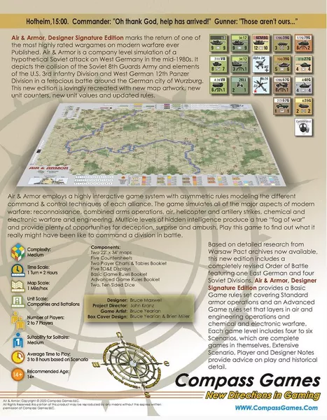 Air & Armor: Wurzburg, Operational Armored Warfare in Europe, Designer Signature Edition marks the return of one of the most realistic wargames on modern warfare ever published. Air & Armor is a grand tactical simulation of a hypothetical Soviet attack on West Germany in the mid-1980s. It depicts the collision of the Soviet 8th Guards Army with elements of the U.S. 3rd Infantry Division and the West German 12th Panzer Division in ferocious battles around the German city of Würzburg. This new edition is lovingly recreated with an updated order of battle, new map artwork, new unit counters, revised rules, and new scenarios.