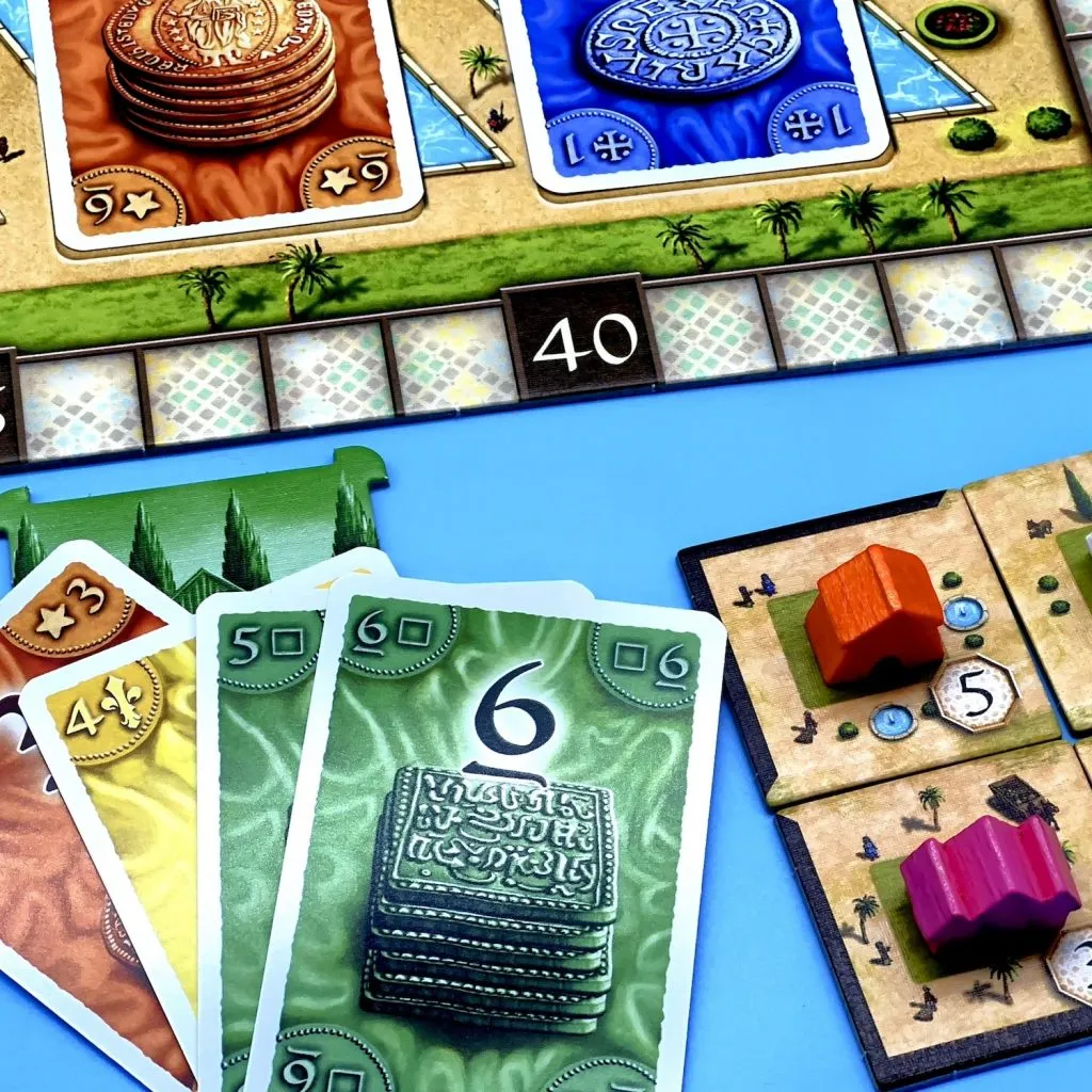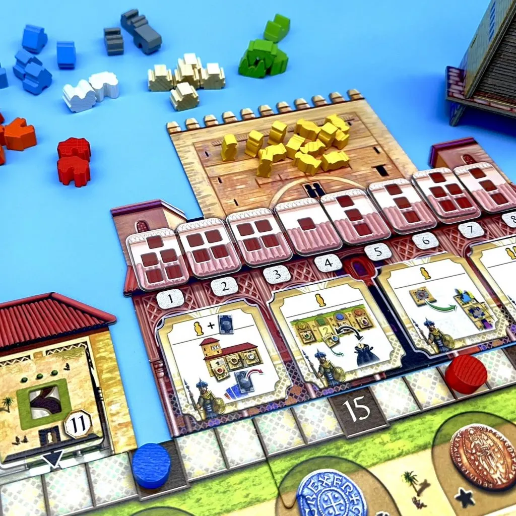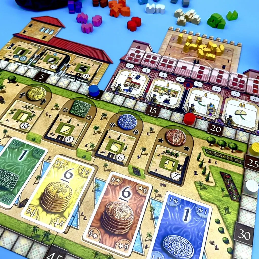 Each player constructs their own Alhambra by taking money cards and using these to purchase buildings of different types. Which buildings you can build are displayed on the building market. Unlike the base game of Alhambra, the buildings are not printed on the tiles, but instead players draw a tile and then a chip which tells them which of the wooden buildings is placed onto the tile. In each of the three scoring rounds, players will receive points if they have the most of each building type, as well as points for their longest connected wall segment.