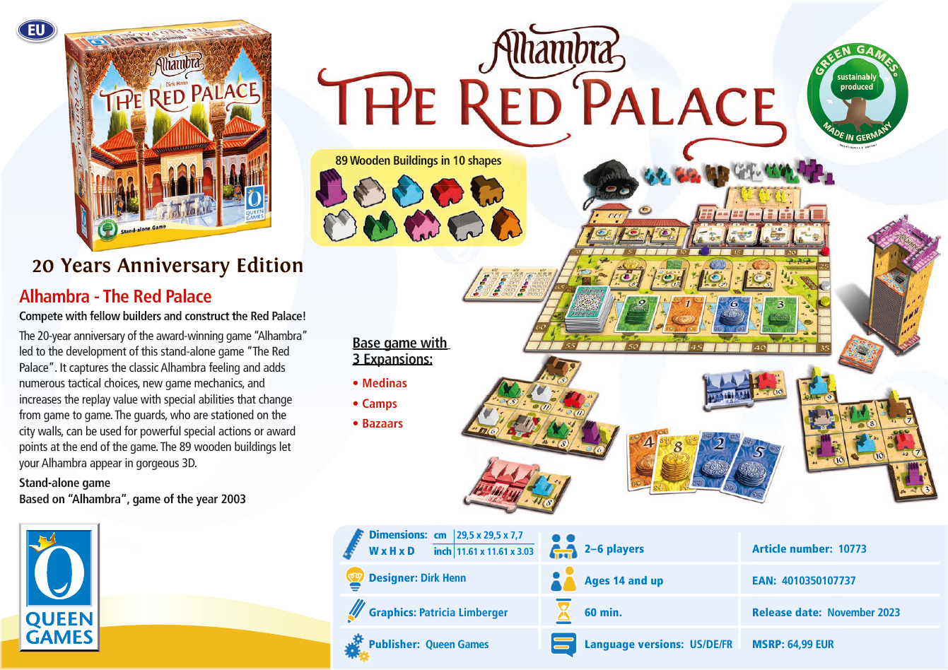 The Red Palace is a standalone game set in the Alhambra Universe that provides a new style of gameplay and is designed specifically for more complexity in the base game. It features: