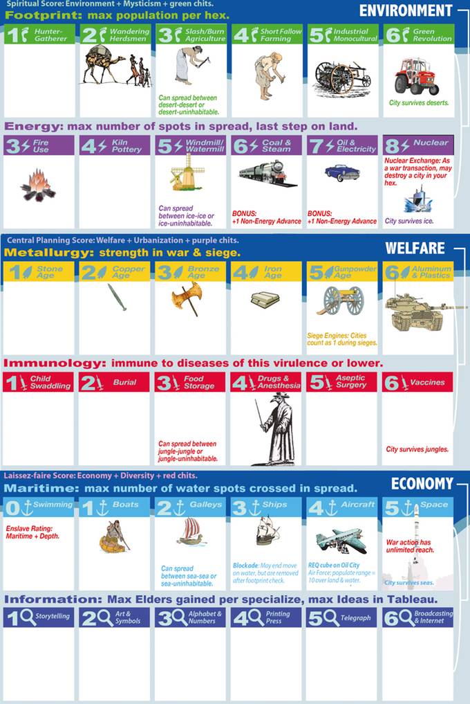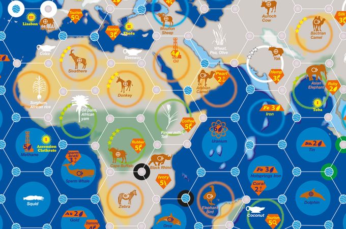 You evolve your population both through spreading on a world map (to acquire land and resources) and spreading on the market of visionary thinking (to acquire action possibilities and technologies). The vision market consists of cards ideas from the evolution of humans that you invest in. The game is driven by events that takes place at set times in history and after a certain number of events, or when someone lands on the Moon if that occurs sooner, the game ends. The winner is calculated based on your progression.