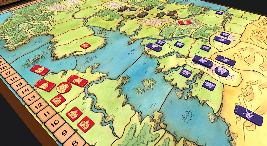The aim of the game is to have the most victory points at the end of the game, which can be gained by building villages, by raiding other players’ villages and by winning battles.