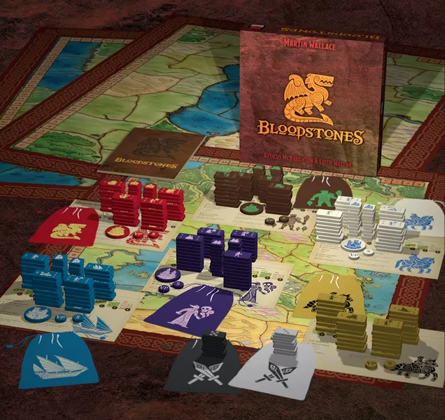Bloodstones is a fantasy wargame for one to six players featuring six different races, each with their own specific powers. Each of the six races in Bloodstones has its own mix of units, represented by domino shape tiles. Some of these units will be unique to that race, such as Dragons to the Dragon Riders and Giants to the Hill Folk.