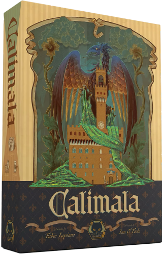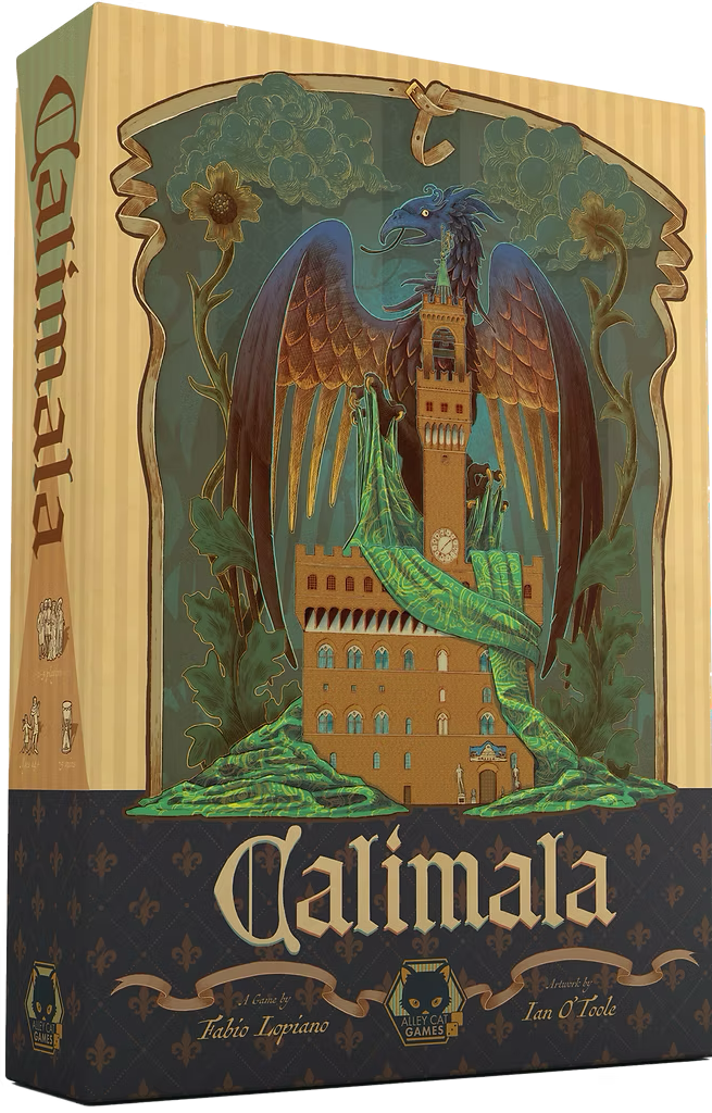 Players of Calimala are cloth merchants in medieval Florence, with a number of trusted employees that they assign to various streets within the city to carry out actions. (Each street connects two places where particular actions can be taken.) While taking these actions, players produce and deliver cloth and contribute to the construction and decoration of various buildings across the city. Employees stay on their assigned places for a while, carrying out their actions whenever the street is activated, and eventually are promoted into the city council, triggering a scoring phase.