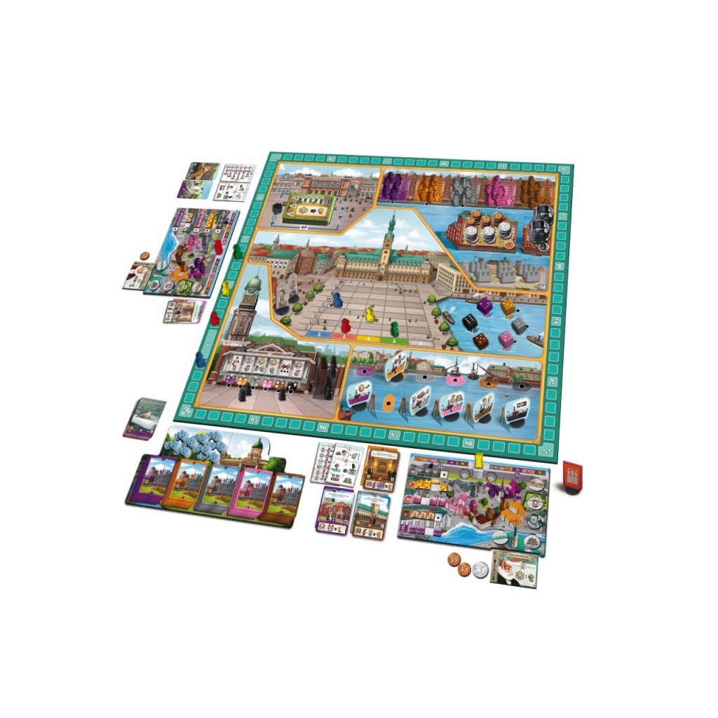 On their turn, players play five cards from any of five stacks of cards, one for each of the five colors in the game. These cards are in thirteen categories, each representing a different location around Hamburg, with seventeen individual cards within each category. Each card in a player's hand may be used for a number of purposes, including building the city wall, activating boats (if a 3 or 4 is rolled), starting a building plot, and constructing a building (card) on the plot, with this building granting a new ability or endgame scoring condition.