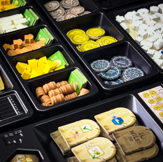 - Inserty - w pudełku znajduje się insert, który pomieści i podstawkę oraz dodatek - z przegródkami na pionki, żetony i karty.
