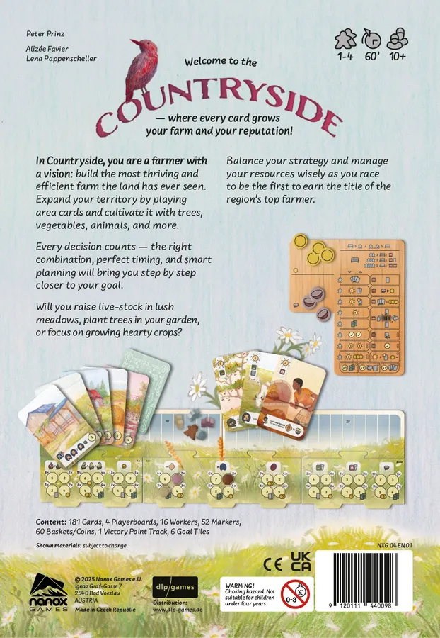 In Countryside, you are a farmer with a vision, and you want to build the most thriving and efficient farm the land has ever seen. To do so, you will expand your territory by playing area cards and cultivate it with trees, vegetables, animals, and more. Will you raise live-stock in lush meadows, plant trees in your garden, or focus on growing hearty crops? Every decision counts as the right combination of items, perfect timing, and smart planning will bring you step by step closer to your goal.