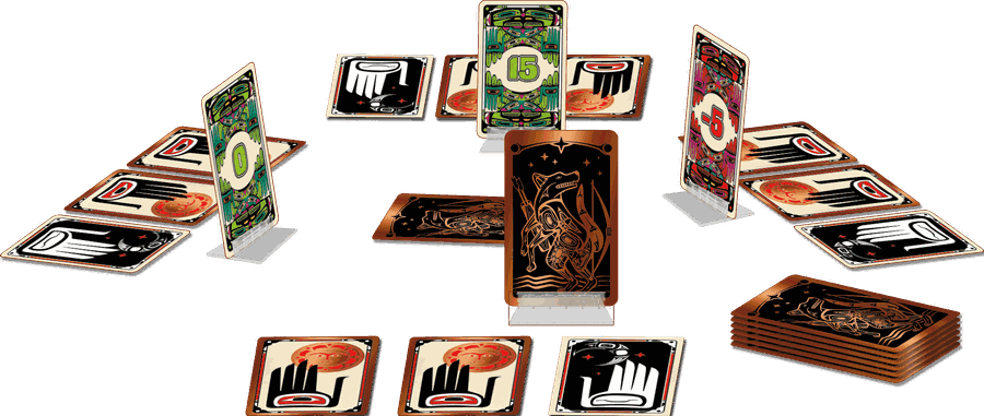 Coyote is in the same game line as Spicy, with the game box and card backs being decorated with a special metallic print in copper. As in the tradition of the Northwest Coast Tribes, copper is a symbol of prosperity and cultural wealth.