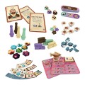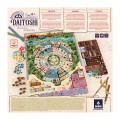 The central panel shows Himeji Castle in all its splendor, divided into several zones. The largest is inside the castle, with the Room of the Thousand Carpets, where the courtiers must ascend socially until they reach the circle closest to the Daimio to enjoy his favor. There is also the pond and the gardens, patiently tended by the gardeners where everyone can relax and contemplate its beauty without restriction. Another important area is the wall and the outside of the castle, where the warriors patrol and stand guard. Finally, we find the area of the three bridges, where the three types of dice that can be used to carry out actions are accumulated, and the personal domain of each player, where they will keep track of their resources and where they will have the reserve of workers.
