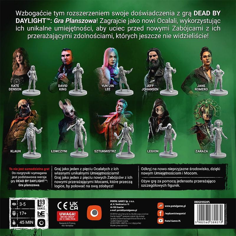 Rozszerzenie Strażnik to 5 nowych Ocalałych: każdy z własną planszą, figurką, zestawem zdolności i sposobami na przetrwanie do odkrycia. To także 5 nowych Zabójców z ich przerażającymi nowymi mocami, które przełamują wszystkie schematy, do których przywykliście w grze podstawowej.