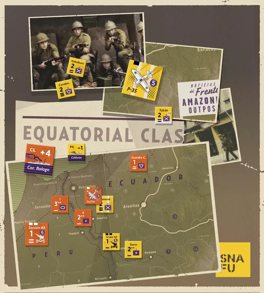 Equatorial Clash is a simulation of the conflict between Ecuador and Perú in July 1941. This small war was the most important clash in the long series of wars, skirmishes and border conflicts between these two countries for the regions that both considered rightfully theirs. The game is centered in the main theatre of operations in the coastal zone.