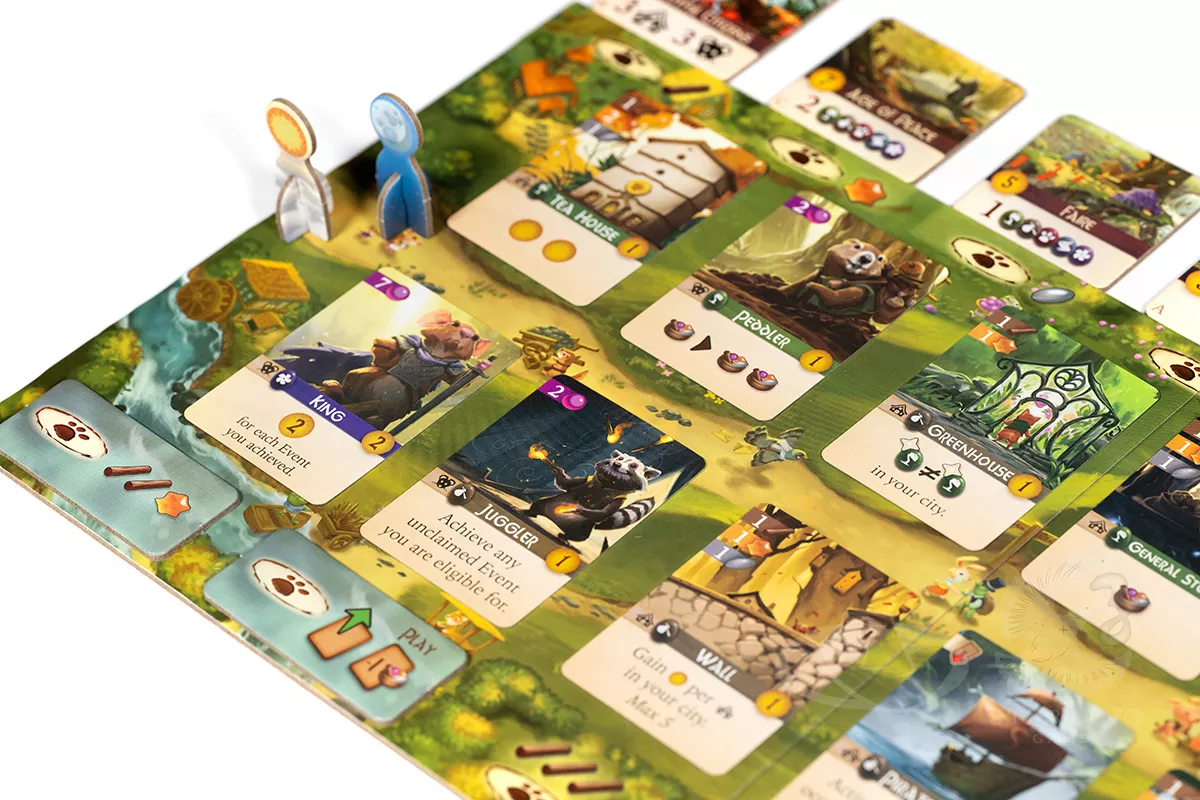Cards may be played from your hand or from the face-up area on the board called the meadow. However, only cards touching the sun or moon token may be played from the meadow, and players move these tokens each time they perform a turn. Therefore, planning for and timing which cards you play is critical.