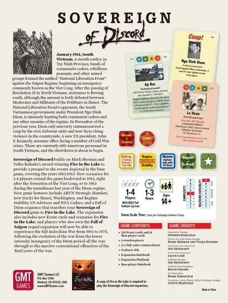 New scenarios allow players to extend the game backward to 1961 right after the formation of the Viet Cong, or to 1963 during the tumultuous last year of the Diem regime. Players owning both expansions, Sovereign of Discord and Fall of Saigon, will be able to experience the full Indochina War from 1961 to 1975. This allows players to see how the war evolved from the lower intensity insurgency of the Diem period all the way to the massive conventional offensives of the last years of the war. A copy of Fire in the Lake will be necessary to play the Sovereign of Discord expansion.