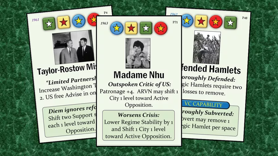 - 72 new Events cover the 1961-1963 period, and four new Pivotal Events represent debates in Washington and Hanoi over their level of aid, the Strategic Hamlet Program by the Diem regime, and the major summer offensive by the Viet Cong. In addition, a new ARVN leader Card, Ngo Dinh Diem, is in play throughout the early 1960s scenarios and new Coup! Events reflect threats to Diem’s hold on power.