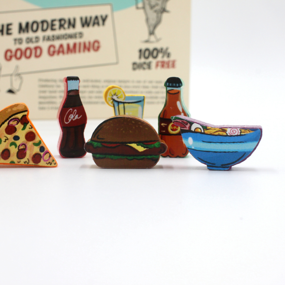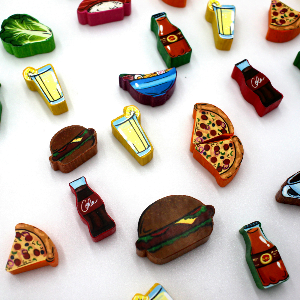 These stickers are crafted to fit the original game pieces from Food Chain Magnate. Moreover, they feature designs on both sides, doubling the visual impact and functionality.