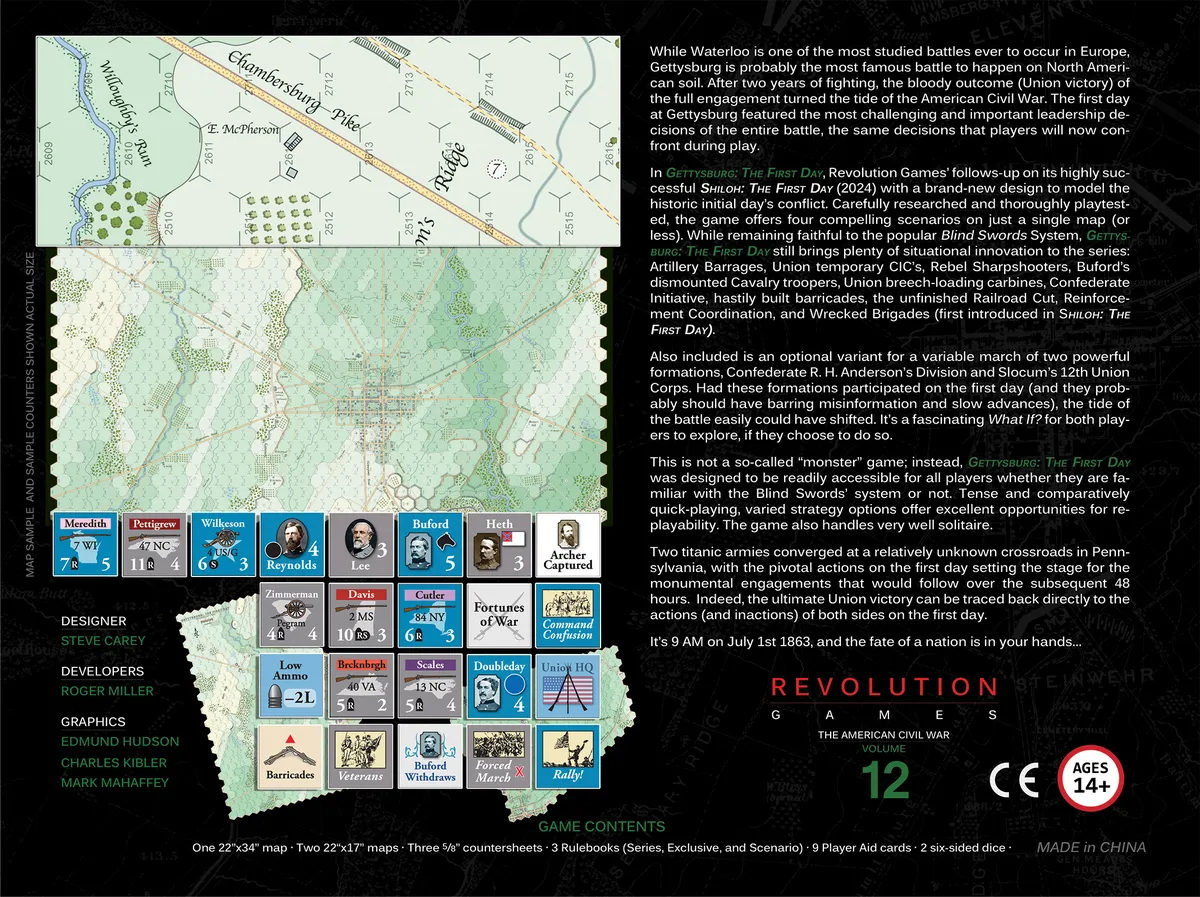 Volume 12 in the Revolution Games American Civil War Series. Simulates the first day of the Battle of Gettysburg.