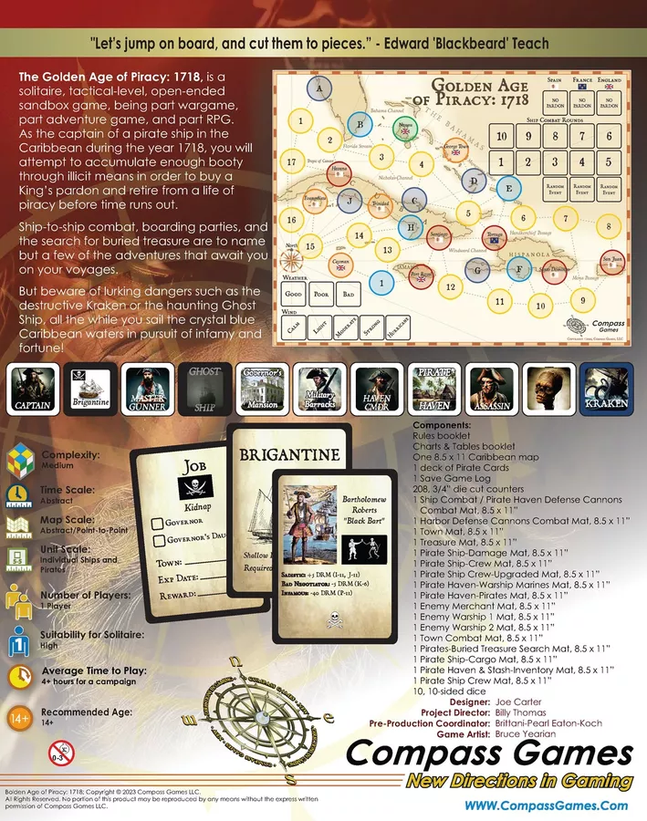 The Golden Age of Piracy - 1718 is an old-school style Tactical level Solitaire board-wargame of action and adventure, with a bit of wargame and RPG elements mixed in. An open-ended sandbox style game where the pirate captain may choose his own path.