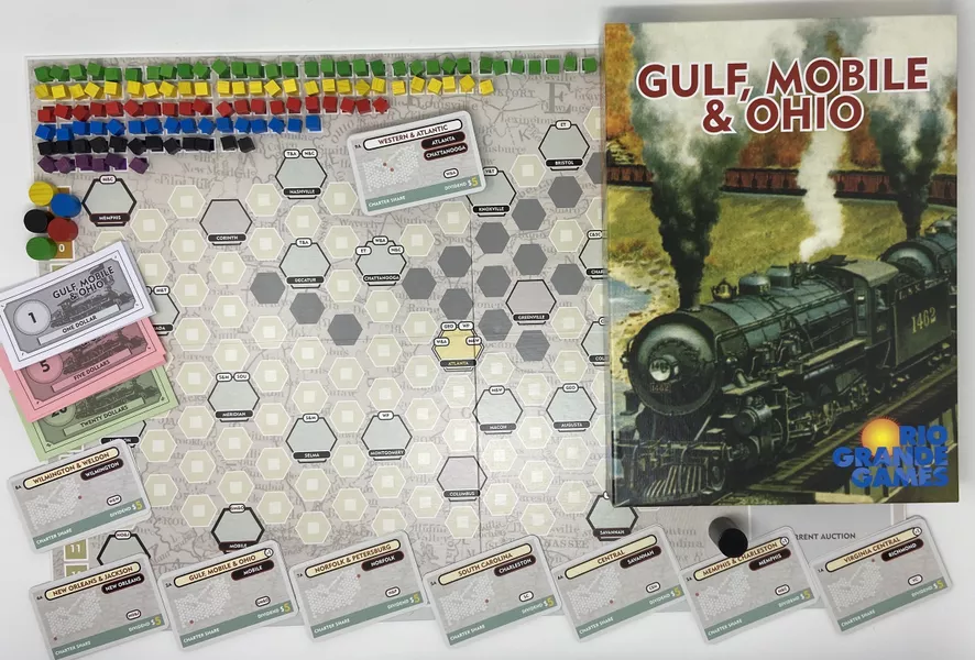In Gulf, Mobile & Ohio, the third entry in Winsome Games's Historic Railroads System, players build railroads in the South that existed between 1830-1860, with the game board featuring cities from Richmond to New Orleans, and from Memphis to Savannah.
