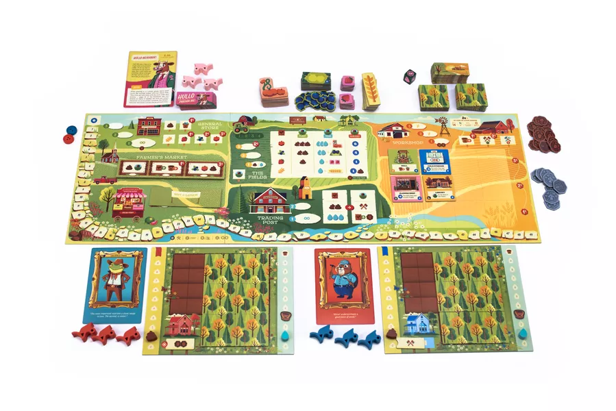 Plant seeds, tend the land, and harvest crops to make money and score points. Clear land to expand your farm, and construct buildings that make your land more efficient and give you endgame bonuses. By the end of harvest season, the farmer with the most points wins!