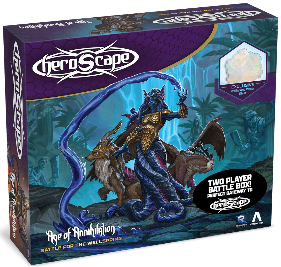 Heroscape: Battle for the Wellspring allows 2 players to take their first steps into the exciting world of the expandable Heroscape miniatures game! Inside this Battle Box are 6 new miniatures which includes three dastardly pirates, a noble wizard, and two familiars. Also included are 4 new scenarios and a new terrain tile - Wellspring water. This game is compatible with previous and upcoming Heroscape releases.