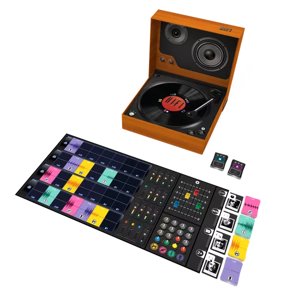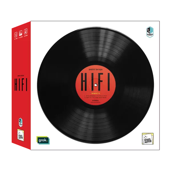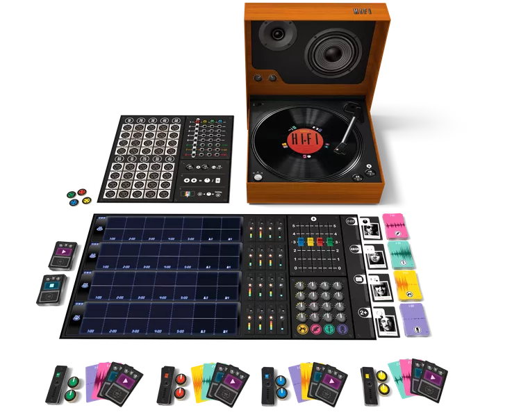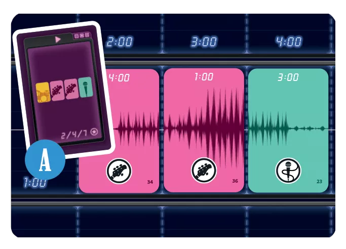 In HiFi, players start their turn by spinning the record's rondel on the turntable to choose an action within their reach, or they can spend production points to achieve one of the other actions. After resolving these actions, players allocate audio cards to the five studio tracks, earning points based on the buttons in that producer's equalization track and what's in the studio track. When a player allocates a guitarist card, each player who collaborated with the equalization of the guitar earns points. When elements such as sound wave or time-track positions match, players can perform bonus actions.