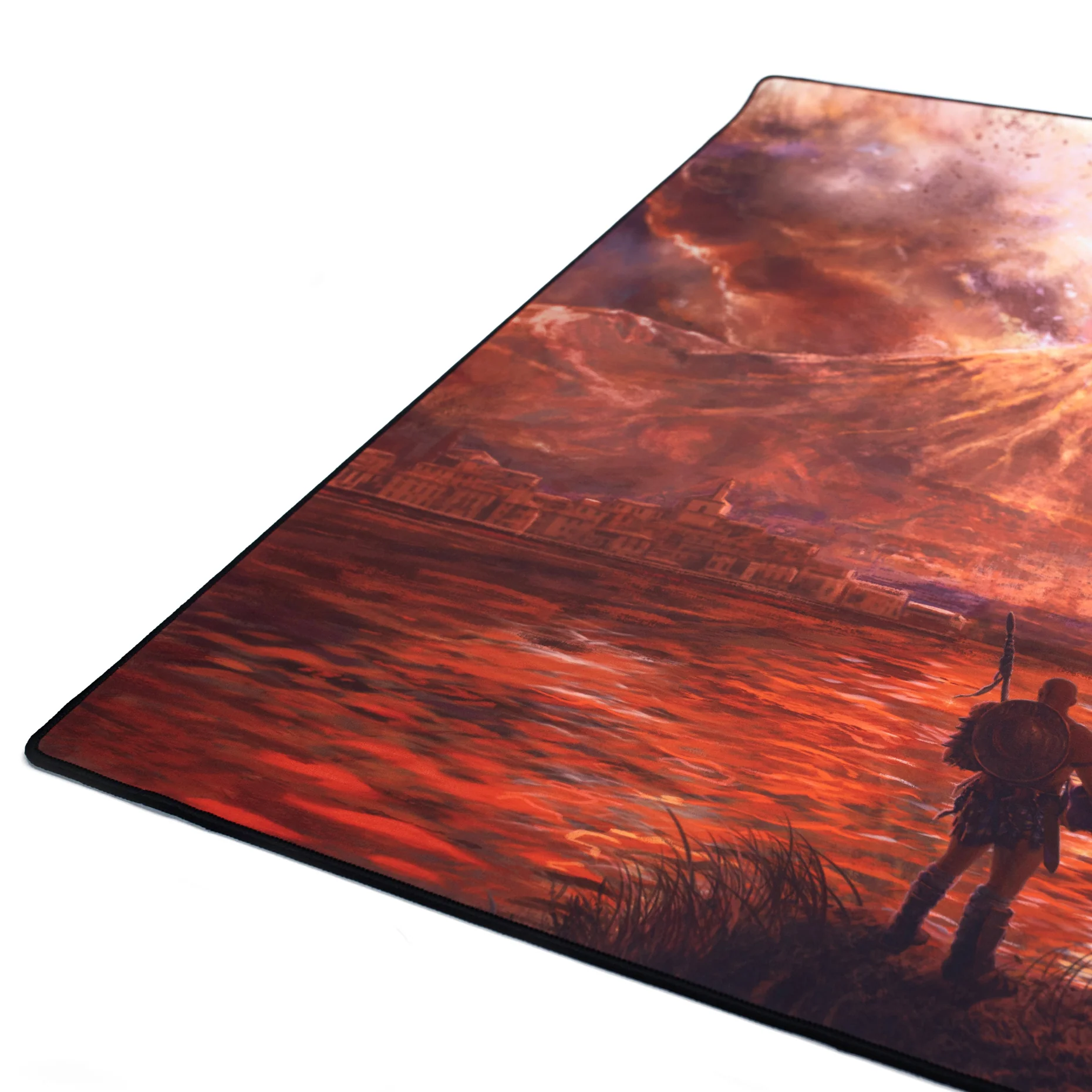 The Hoplomachus Victorum playmat transports you to the end of the world as the 36” x 35” edge-stitched beauty covers your table in lava-soaked neoprene. The wondrous art of Anthony LeTourneau depicts a Hoplomachus hero staring across the waters at the end of everything.