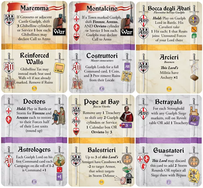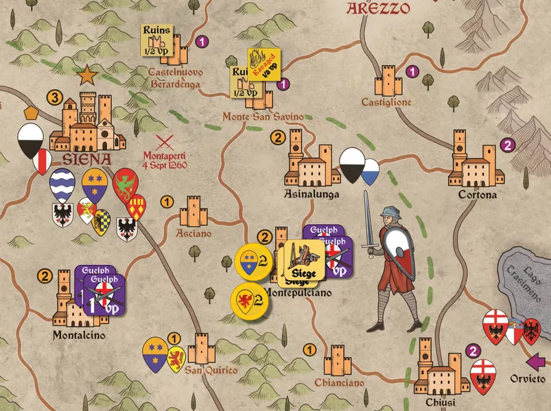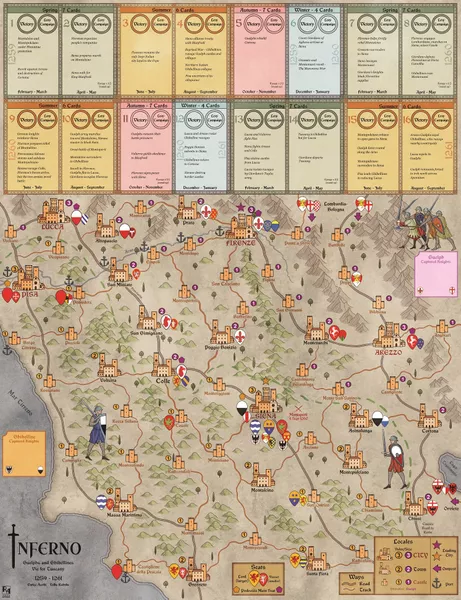 Tuscany, 1259. As wealth from crafts and foreign trade elevated northern Italy’s urban families above the landed lords, rivalries within and among their cities hardened into conflict between two great parties. The Ghibellines aligned with the Hohenstaufen emperors who ostensibly ruled Italy, while the Guelphs backed rival imperial claimants and the greatest challenger to the Emperor’s authority, the Pope. Should any faction gain advantage, others coalesced to resist.