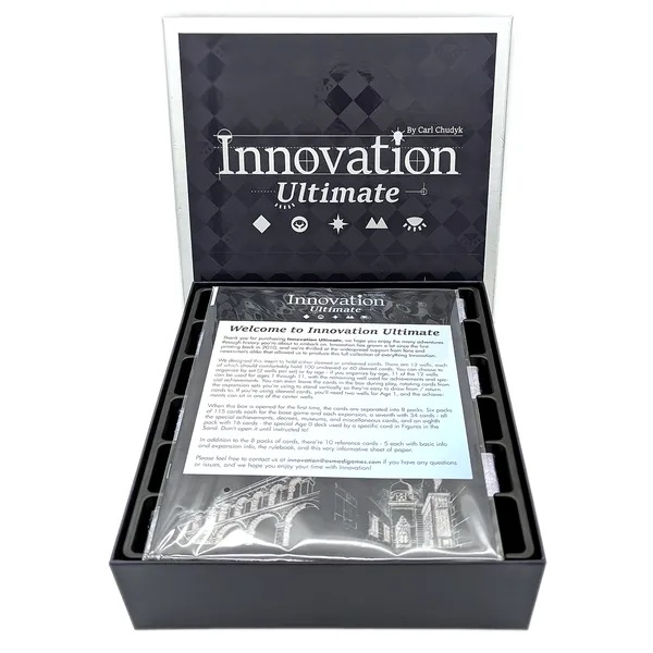 Innovation Ultimate is a box set containing Innovation and all five of its expansions, which includes a brand new expansion titled The Unseen. Many, many updates have been made to this edition. First, Age 11 has been added, representing the recent past and potential near future at the time of release. Lots of language and mechanics have been streamlined, and in particular, the expansions have all been heavily reworked to be more accessible and easy to include while playing.