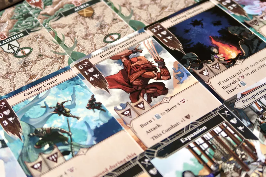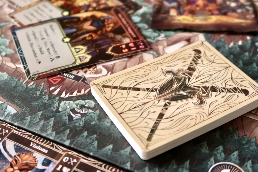 As the Commander of the Ironclad, your primary goal is to lay down the foundations of your forges in the outer mountains, and once you have collected enough crystals, build forges on the foundations. As the Chieftain of the Woodwalkers, your mission is to locate your people’s ancient totems through Vision cards, clear the path to them by defeating Ironclad warbands, and finally securing them in the outer forests, beyond the Ironclads’ reach. Once you have retrieved the third totem as the Chieftain, or built the third Forge as the Commander, you immediately win the game.