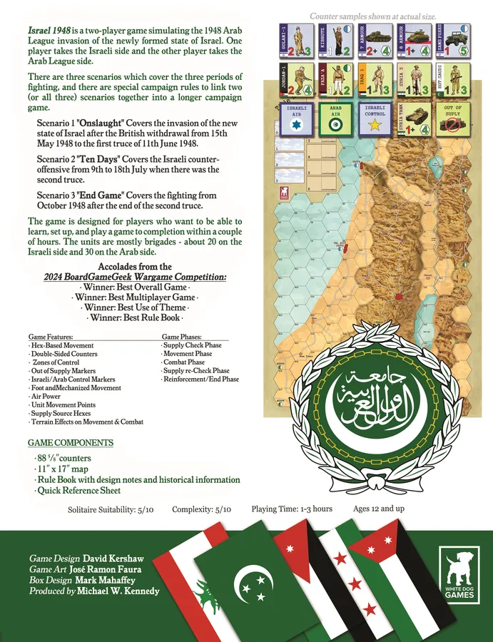 A 2-player game covering the 1948 Arab-Israeli war. One player plays the Israeli forces and the other plays the Arab League forces. There is a hex map of Israel and surrounding countries. The units are mostly brigades - about 20 on the Israeli side and 30 on the Arab side.