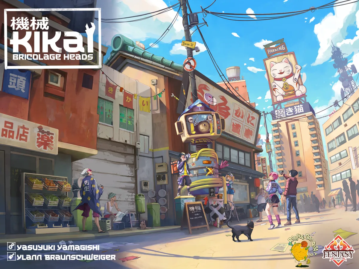 Enter a mysterious world of street art in a mysterious city in BRICOLAGE HEADS. Make art quickly and promote it even more quickly so that your opponent doesn't steal your fans. After all, by bringing in fans you can get kick-ass effects. The higher the value, the more fans you can bring in at once — but you cannot concentrate solely on increasing the value because the player who draws the last fan from a town square gains the right to erect their own sign in that square.