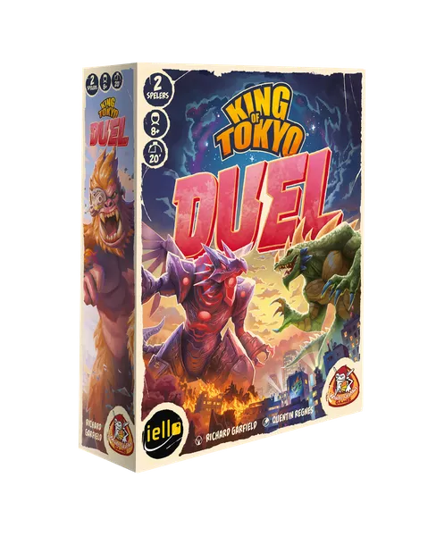 King of Tokyo Duel is a two-player tug-of-war dice game in the King of Tokyo line. Choose your uniquely-powered monster and roll new dice to draw the fame and destruction tokens toward you...or smash your rival with new special power cards to become the ultimate King of Tokyo!