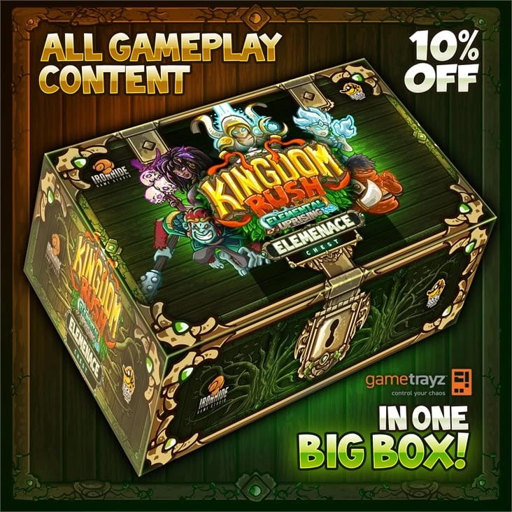 Get ALL gameplay content for Kingdom Rush: Elemental Uprising in a single Elemenace Chest with deluxe upgrades & Game Trayz storage!