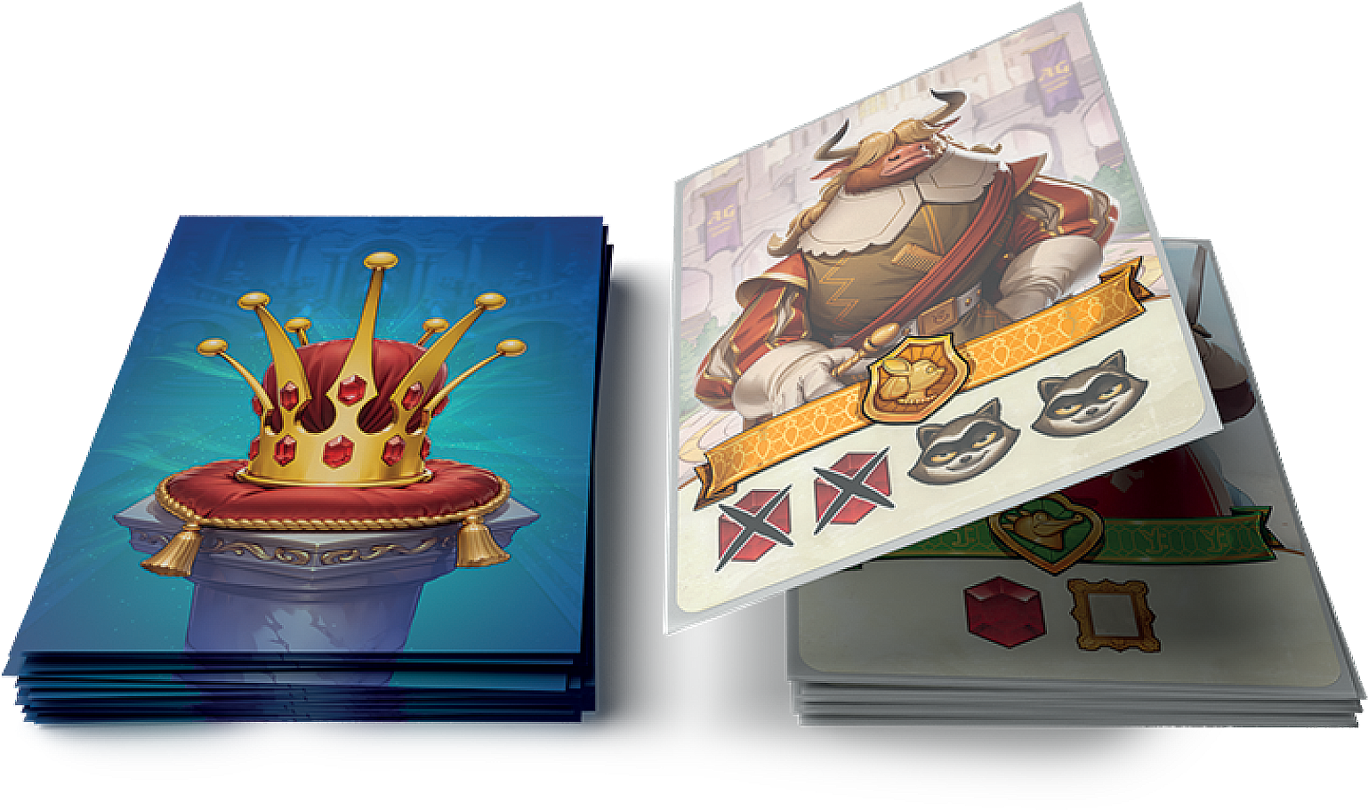 - Z Koroną władzy mamy okazję wypróbować wyjątkową mechanikę budowania wspólnej talii. Gracze oznaczają swoje karty koszulkami z herbem, jednak wszystkie są tasowane w jeden wspólny zestaw.