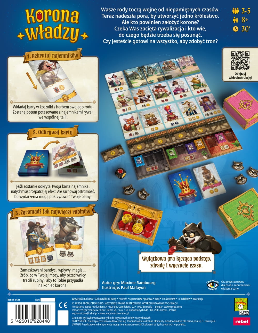 Korona władzy to wyjątkowa gra karciana, łącząca podstęp, zdradę i wyczucie czasu. Przez 4 rundy będziecie rekrutować najemników, wysyłać do rywali zamaskowanych bandytów, zwiększać swoje wpływy, a czasem nawet sięgać po odrobinę magii, by przeciwnicy tracili rubiny. A wszystko po to, aby zwyciężyć w tej grze o koronę!