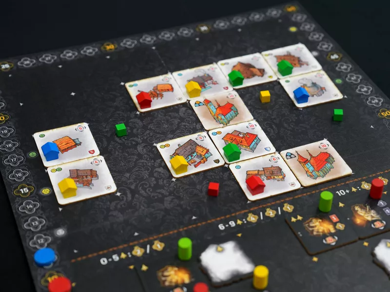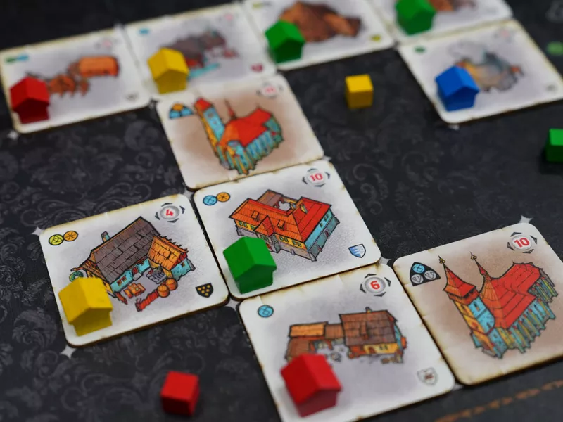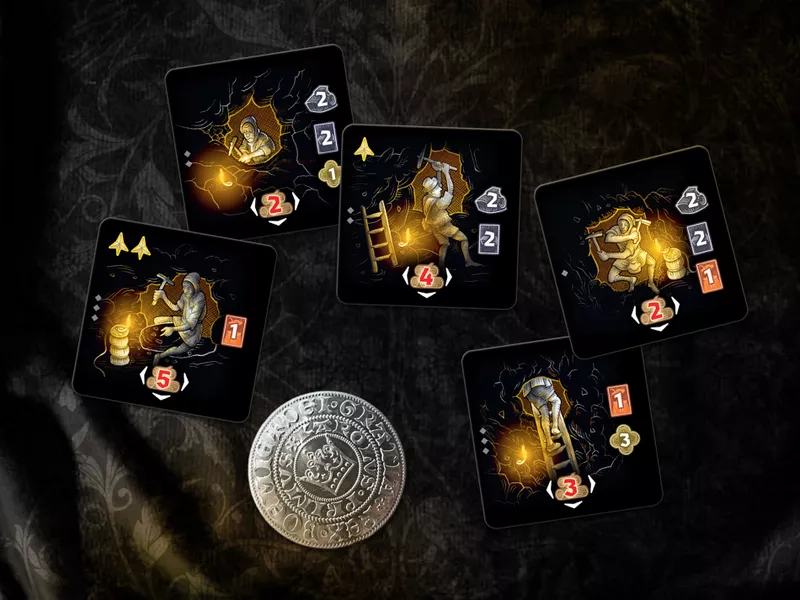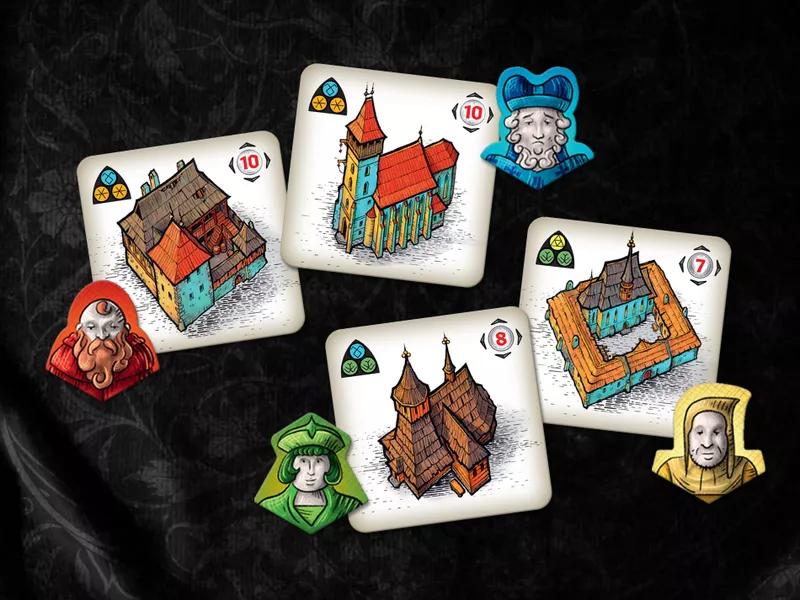 In each round, players take turns selecting actions from a hand of double-sided cards to engage strategic plans like mining, purchasing plots of land on which to build, gaining permits, raising buildings for their affiliated guilds, gaining profit from their production, and of course working towards the construction of Saint Barbara's Cathedral.