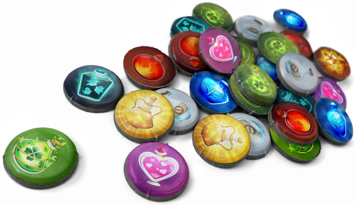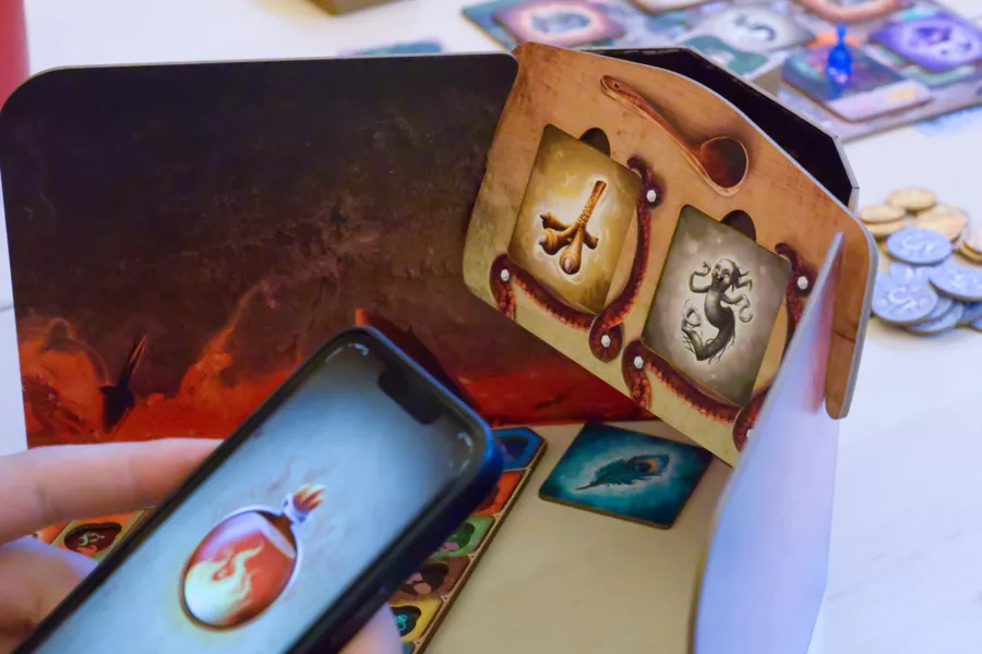Not sure how to make potions? No sweat! Potion craft takes mere seconds with the free Little Alchemists companion app. To make a potion, players select two ingredient tiles, then scan them using the companion app loaded onto a tablet or smartphone. This reveals the combined result and lets players acquire and mark the corresponding potion knowledge on their secret player board.
