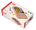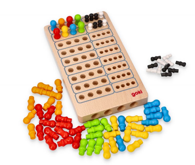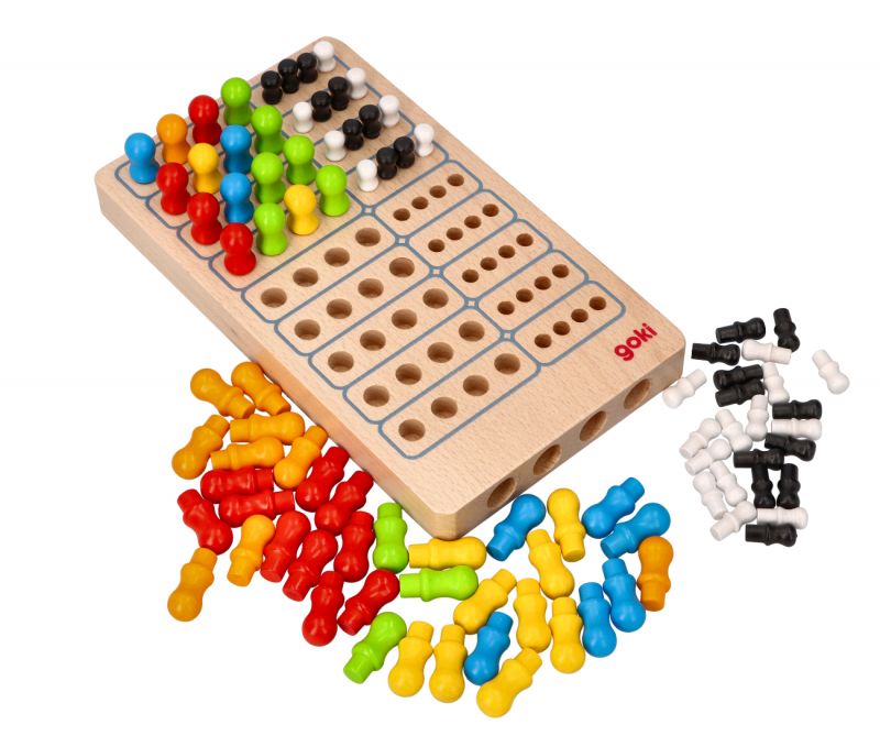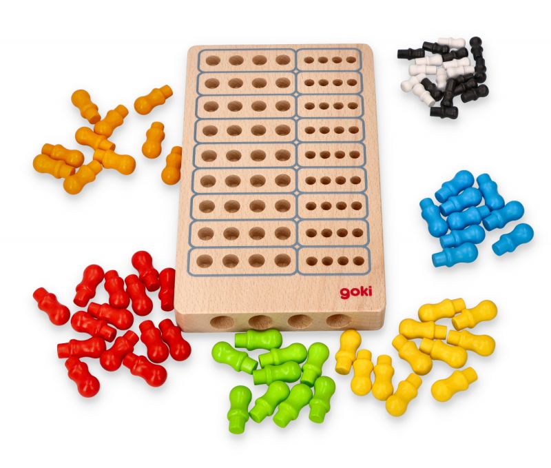 W zestawie 1 plansza, po 12 kołeczków w kolorze żółtym, niebieskim, czerwonym pomarańczowym oraz zielonym i po 20 kołeczków w kolorze białym i czarnym.