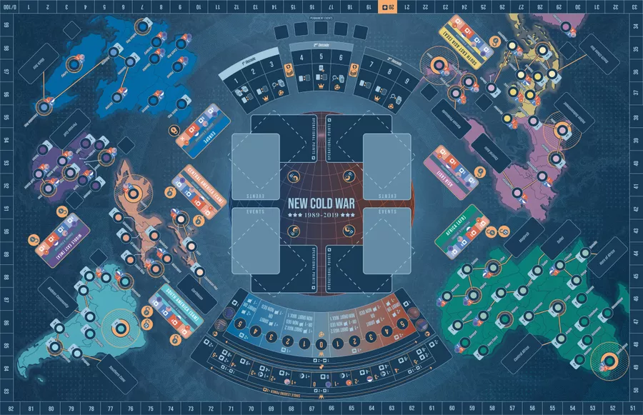 New Cold War is a Card-Driven Game based in the most important geopolitical events from 1989 to 2019. Players lead one of the four great powers (Russia, China, US, EU) in their fight for the new world order. Initially, the confrontation is between the red bloc, consisting of Russia and China and the blue bloc, comprising the United States and the European Union. However, each player must also prioritize their own strategy, as only one power can emerge victorious at the end of the game. Therefore, this game starts with cooperation between allied powers in the early stages but becomes entirely competitive as the moment of final victory approaches.
