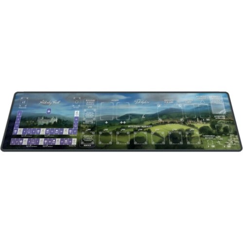 The mat measures 950 mm × 262 mm and covers approximately the same area as the round tracker, supply board, and the side board from the “Characters” expansion. It has been designed with the most common table configuration in mind to maintain a consistent panoramic background.