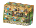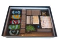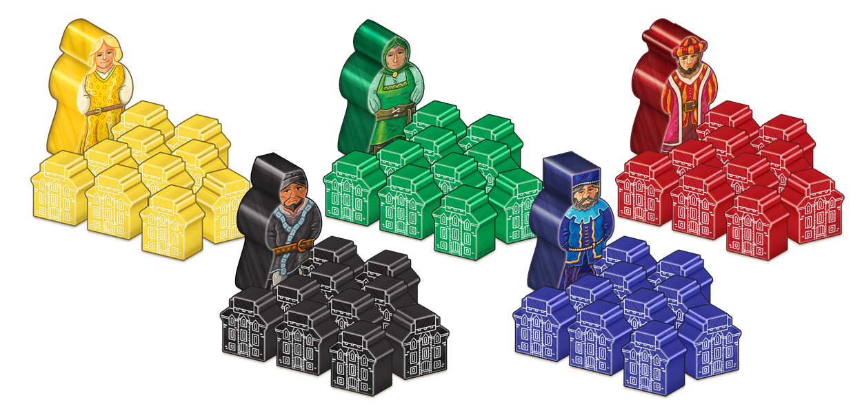 The equipment are luxurious. Among other things, it contains an INLAY with removable BOXES, METAL COINS, GOODS, and FOLLOWERS made of wood, embroidered CLOTH BAGS in player colors, individual PLAYER FIGURES and metal STARTING PLAYER TOKEN.