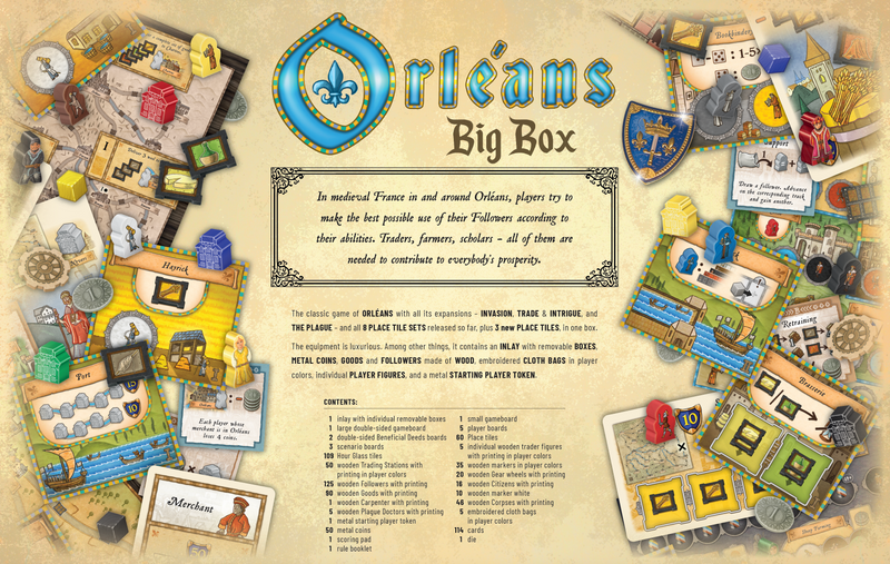 The classic game of Orleans with all expansions: INVASION, TRADE & INTRIGUE and THE PLAGUE - and all 8 PLACE TILE SETS released so far plus 3 new PLACE TILES in one box.