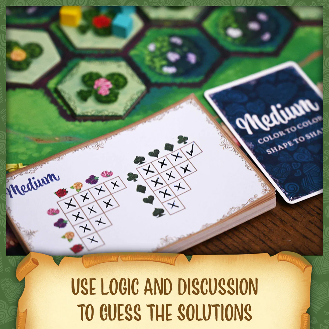 Every turn, together as a team you must guess at least one of these secret whim cards. You can't say what your card shows, but by carefully placing a new shrub tile into the garden (taken from those available in the Greenhouse) you are able to reveal clues, tokens that will show any matches between the arrangement in the garden and the secret whims each player holds in their hands.