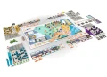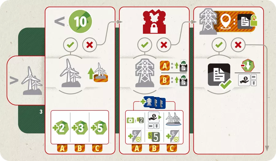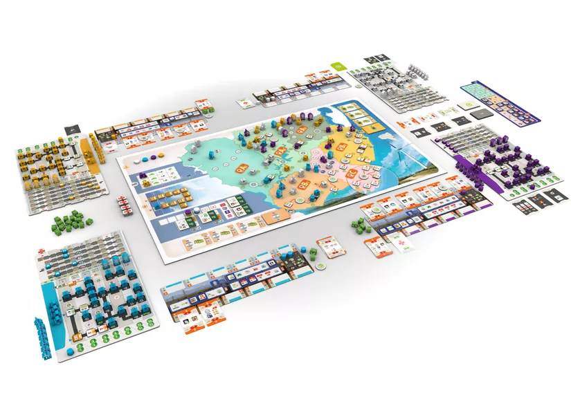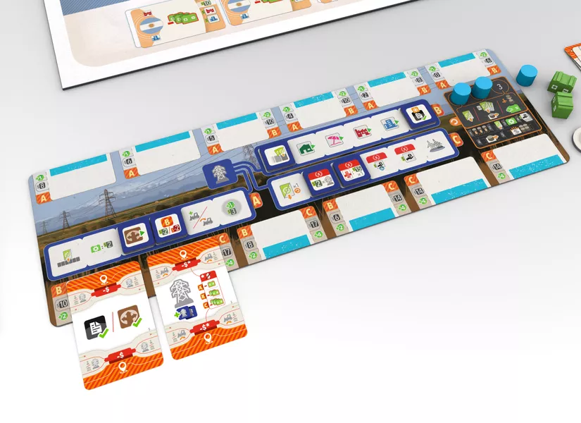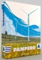 Pampero is a hand-management, card-driven action-selection game. Every player has a starting set of eight cards to be played on their own tableau, which contains two rows of spaces to activate actions on the different sectors of the board. Each turn, you have the option to play a card to the leftmost empty space of either row or to retrieve all cards from your tableau. After three actions, a special phase takes place — consolidation, during which you retrieve the rightmost card from any row, generate batteries from stored energy, collect income, and advance the game timer. The player with the most money at the end of the game wins.
