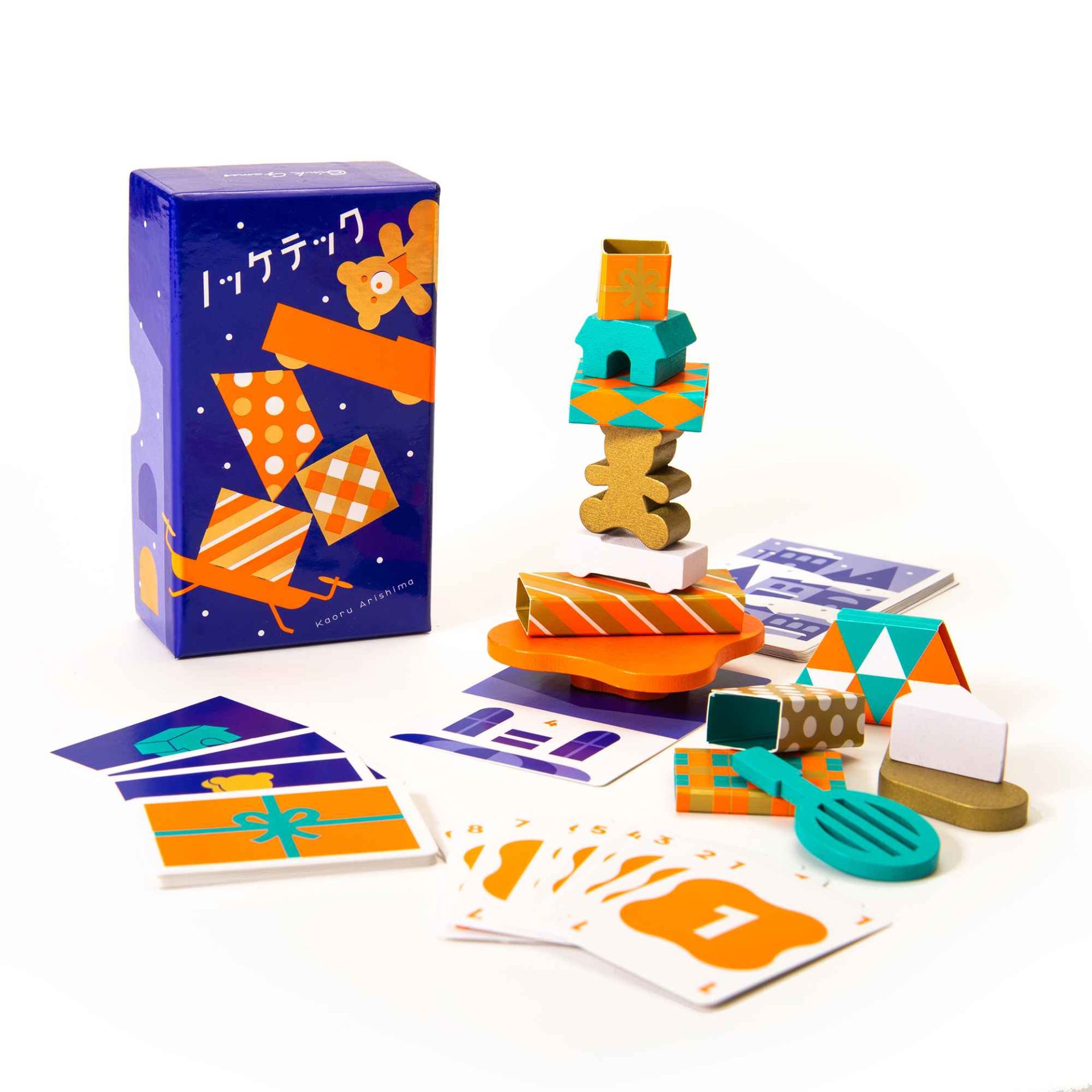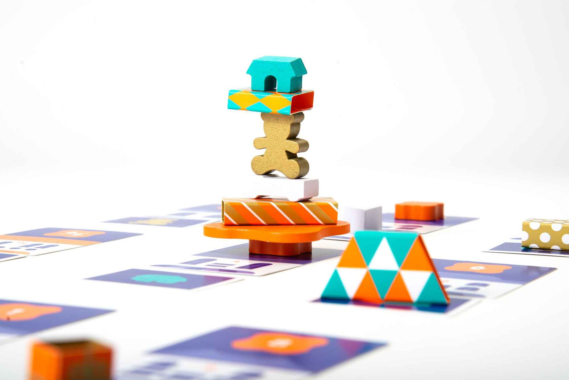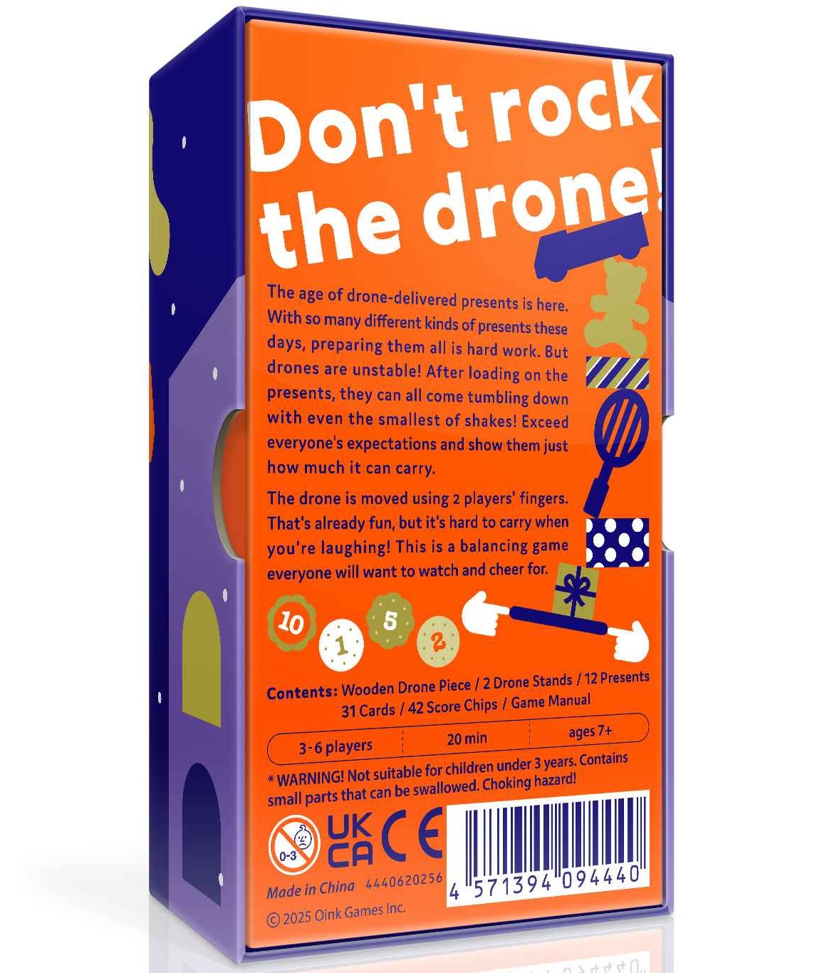 Pick 'n Packers is a balance game where two players work together to carry a drone stacked with presents. Each player uses only one finger to pinch and lift a wooden drone piece. Even the slightest difference in finger pressure causes the drone, and the presents on top, to shake, sparking excitement at the table!