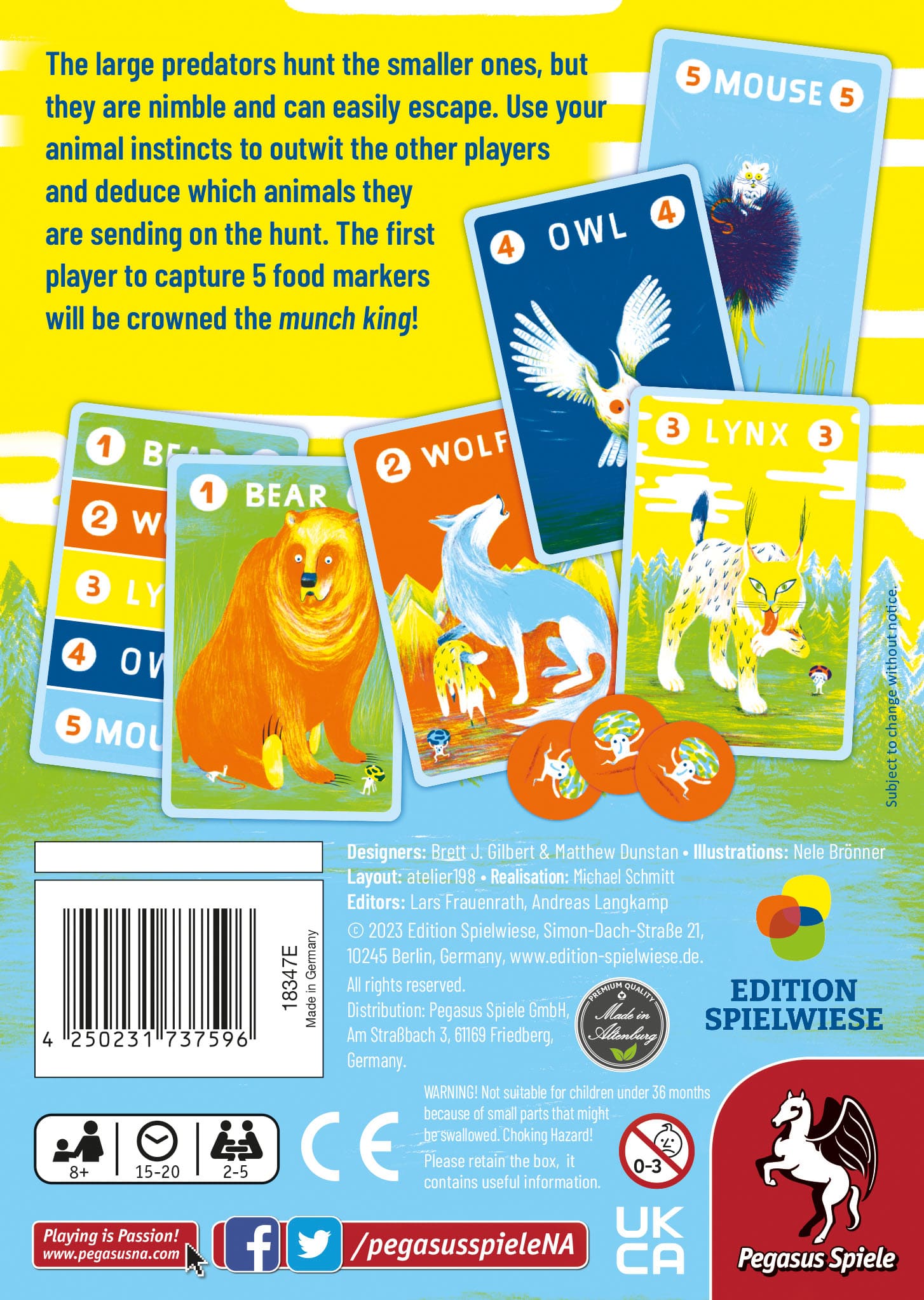 The large predators hunt the smaller ones, but they are nimble and can easily escape. Use your animal instincts to outwit the other players and deduce which animals they are sending on the hunt. The first player to capture 5 food markers will be crowned the munch king!